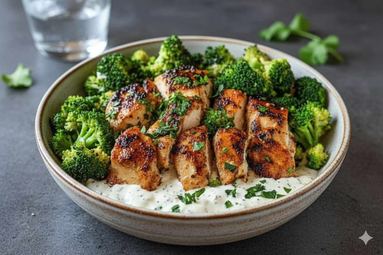 5. Assemble: Slice the grilled chicken into strips. Arrange a bed of broccoli in each bowl, top with the chicken, and drizzle generously with the warm garlic cream sauce.