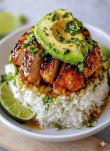 - The Final Stack: Place a ring mold (or a large circular cookie cutter) in the center of a plate. Layer the rice first, followed by a portion of the glazed chicken, and top with the sliced avocado. Carefully lift the mold to reveal your masterpiece.